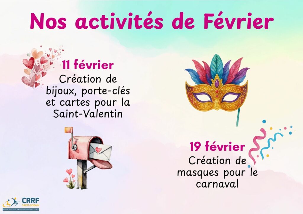 Pour ce mois de Février, nos animatrices vous divertiront autour de 2 ateliers : création de bijoux, porte-clés et cartes pour la St-Valentin ❤️, et création de masques pour le carnaval 🥳