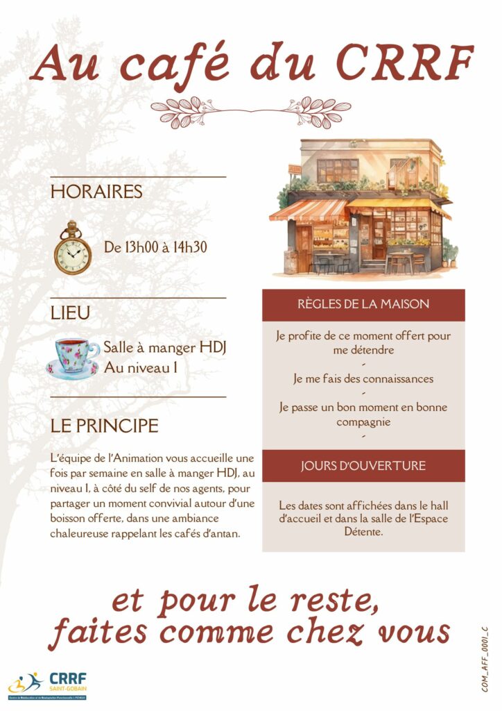 Un accueil café gratuit a également lieu chaque semaine en salle à manger HDJ, à côte du self du personnel.